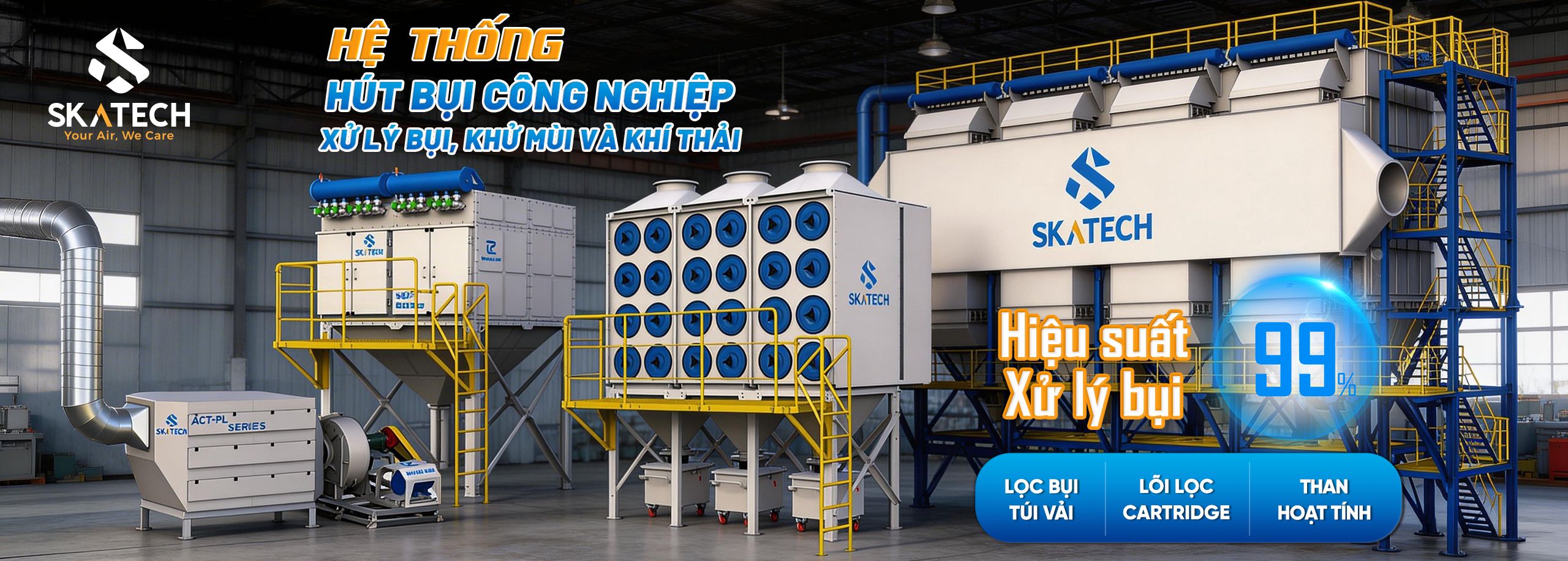 - Hệ thống hút lọc bụi Cartridge như: CDF-PL-SERIES https://skatech.vn/he-thong-loc-bui-cartridge-cdf-pl-series/, VDC – PL SERIES https://skatech.vn/he-thong-hut-loc-bui-cartridge-vdc-pl-series/