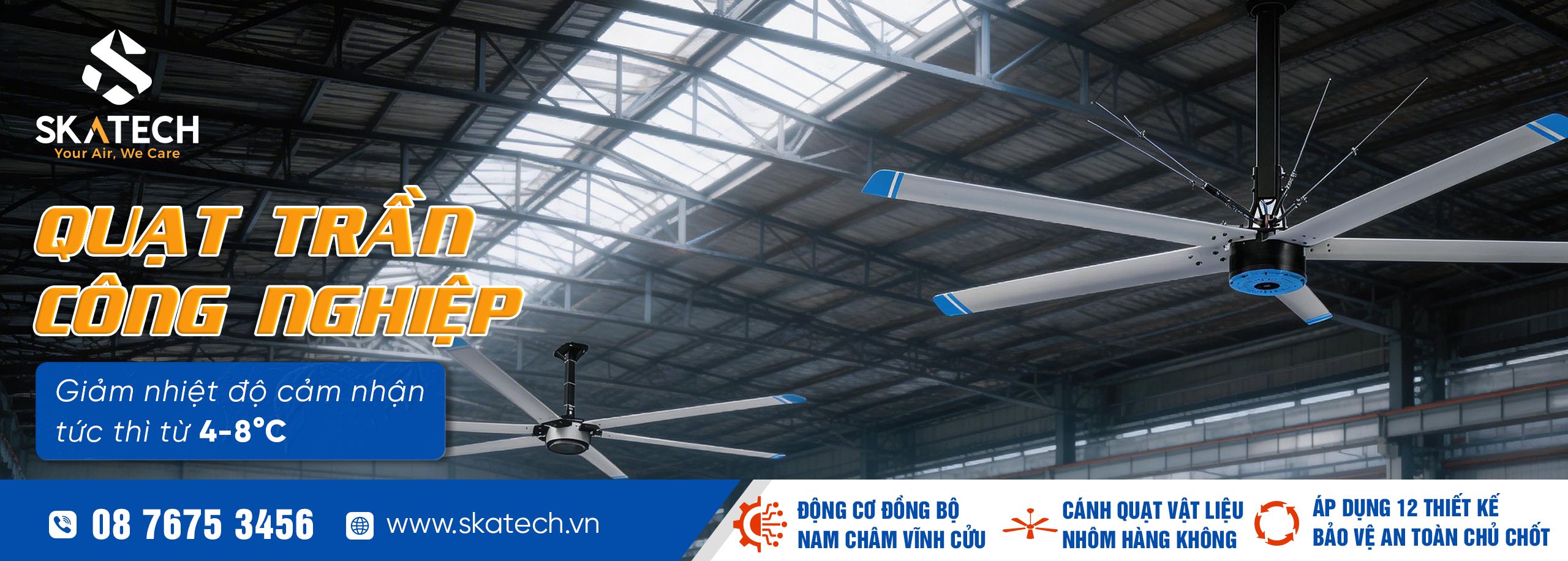 Trong các môi trường công nghiệp, việc đảm bảo không khí lưu thông và làm mát hiệu quả không chỉ ảnh hưởng đến năng suất lao động mà còn tác động trực tiếp đến sức khỏe và sự an toàn của nhân viên. Đây chính là lúc quạt trần công nghiệp trở thành giải pháp không thể thay thế. Với thiết kế công suất mạnh mẽ, độ bền vượt trội và khả năng hoạt động ổn định trong các điều kiện khắc nghiệt, quạt trần cánh dài không chỉ tối ưu hóa không gian làm mát mà còn tiết kiệm năng lượng đáng kể. Hãy cùng Skatech khám phá tất cả những điều bạn cần biết về quạt trần công nghiệp cánh dài, từ cách chọn mua phù hợp đến bí quyết sử dụng và bảo trì để đạt hiệu quả tối đa!